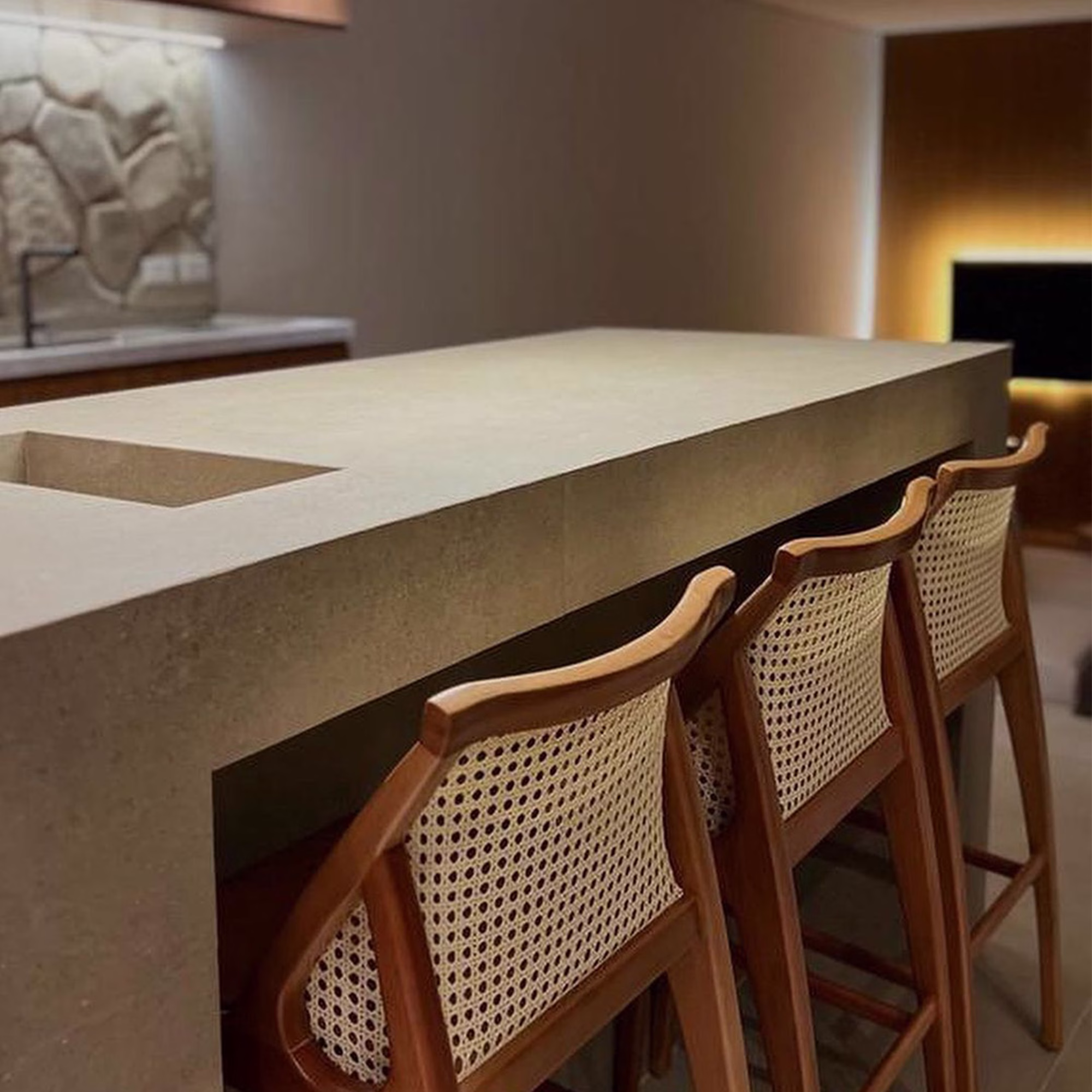 Trabalhamos com MDF de primeira linha, lâmina natural de madeira, pintura laqueada e palha indiana. Não usamos adesivo imitando textura de madeira. O acabamento é feito na nossa própria fábrica em Pedreira, SP, com controle de qualidade em cada etapa.