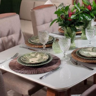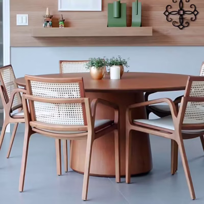 Trabalhamos com MDF de primeira linha, lâmina natural de madeira, pintura laqueada e palha indiana. Não usamos adesivo imitando textura de madeira. O acabamento é feito na nossa própria fábrica em Pedreira, SP, com controle de qualidade em cada etapa.