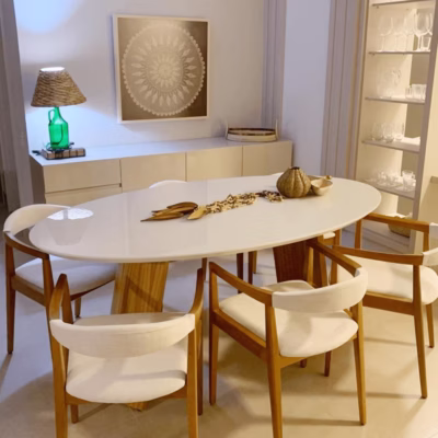 Trabalhamos com lâmina natural de madeira, MDF de primeira linha e pintura laqueada. Nada de adesivo imitando textura. Você sente a diferença quando passa a mão no móvel.