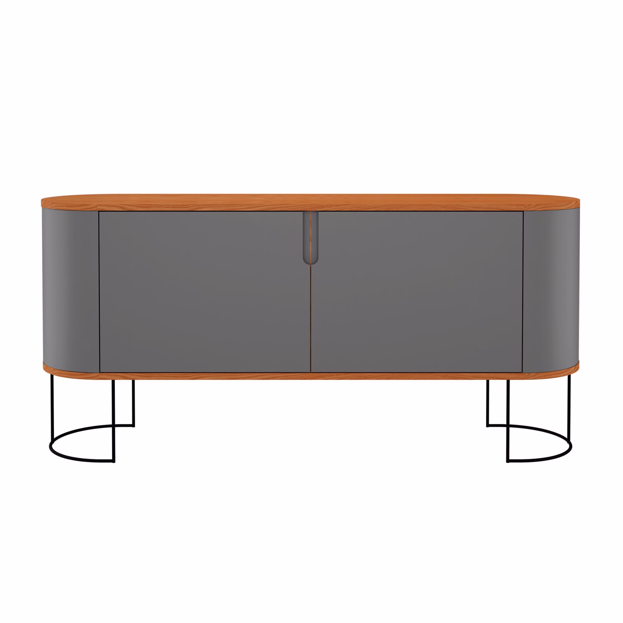 As laterais e o tampo são curvados, o que dá ao móvel um visual leve mesmo sendo robusto. As portas têm dobradiças com amortecimento, então fecham devagar e sem barulho. Por dentro, prateleiras ajudam a organizar louças, copos ou o que você quiser esconder ali. Os pés são de metal com acabamento em laca, e você escolhe a cor da base na hora da compra.