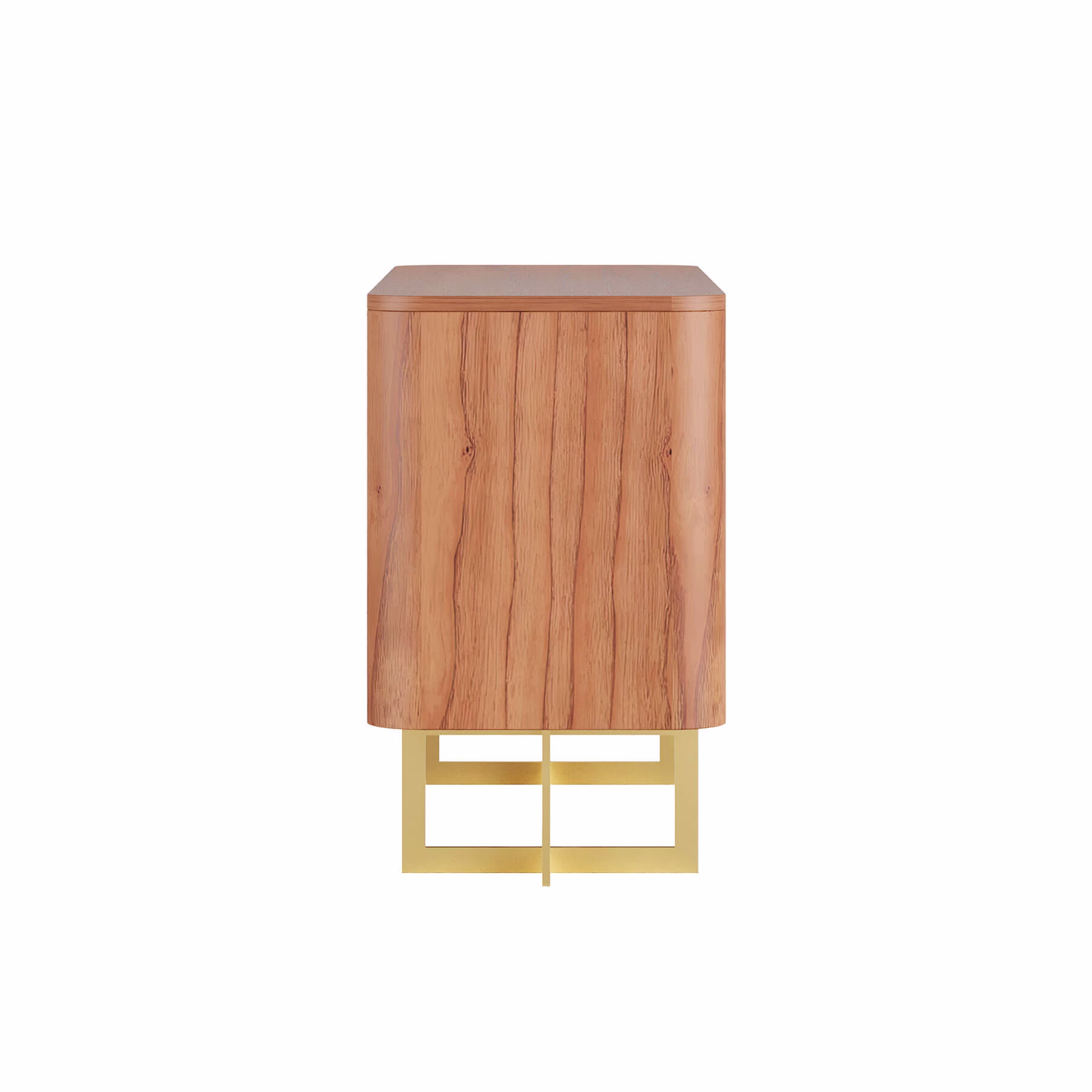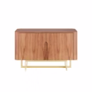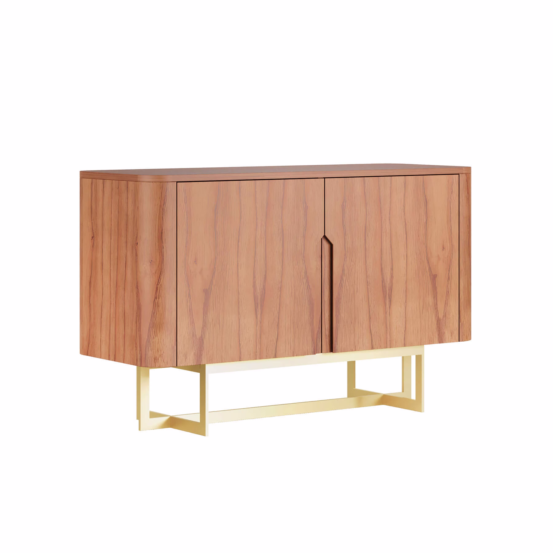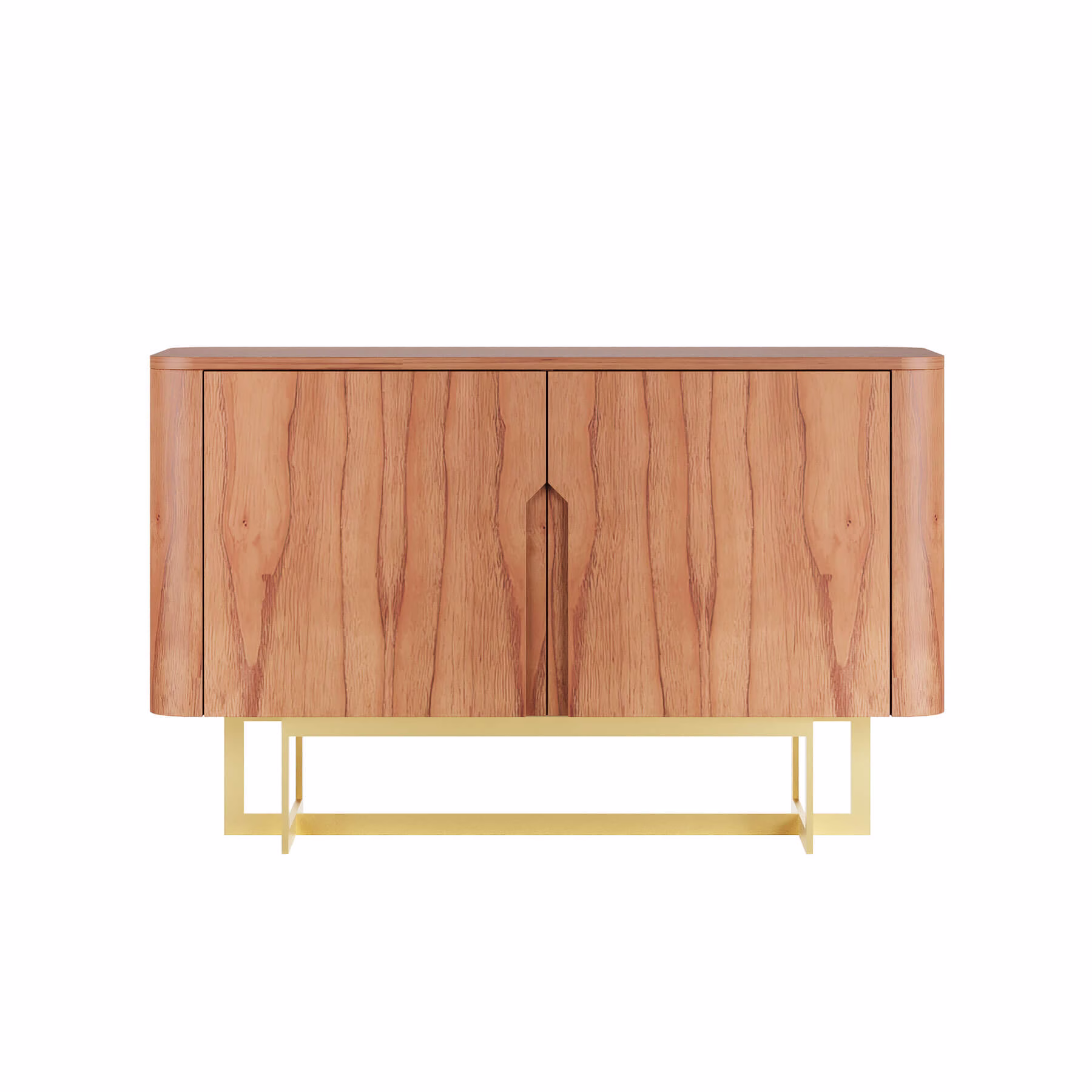 As laterais e o tampo são curvados, o que dá ao móvel um visual leve mesmo sendo robusto. As portas têm dobradiças com amortecimento, então fecham devagar e sem barulho. Por dentro, prateleiras ajudam a organizar louças, copos ou o que você quiser esconder ali. Os pés são de metal com acabamento em laca, e você escolhe a cor da base na hora da compra.