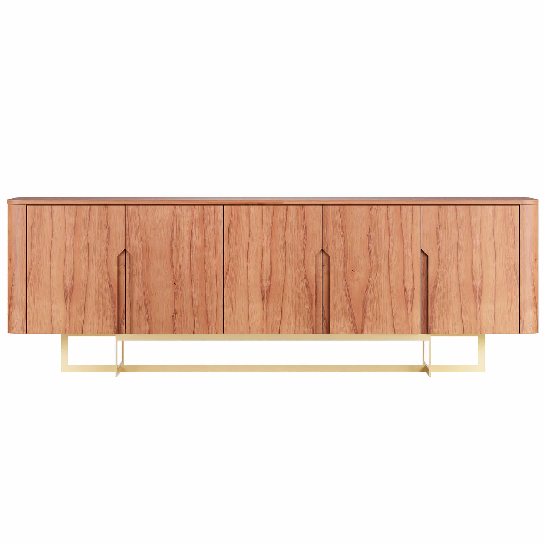 As laterais e o tampo são curvados, o que dá ao móvel um visual leve mesmo sendo robusto. As portas têm dobradiças com amortecimento, então fecham devagar e sem barulho. Por dentro, prateleiras ajudam a organizar louças, copos ou o que você quiser esconder ali. Os pés são de metal com acabamento em laca, e você escolhe a cor da base na hora da compra.