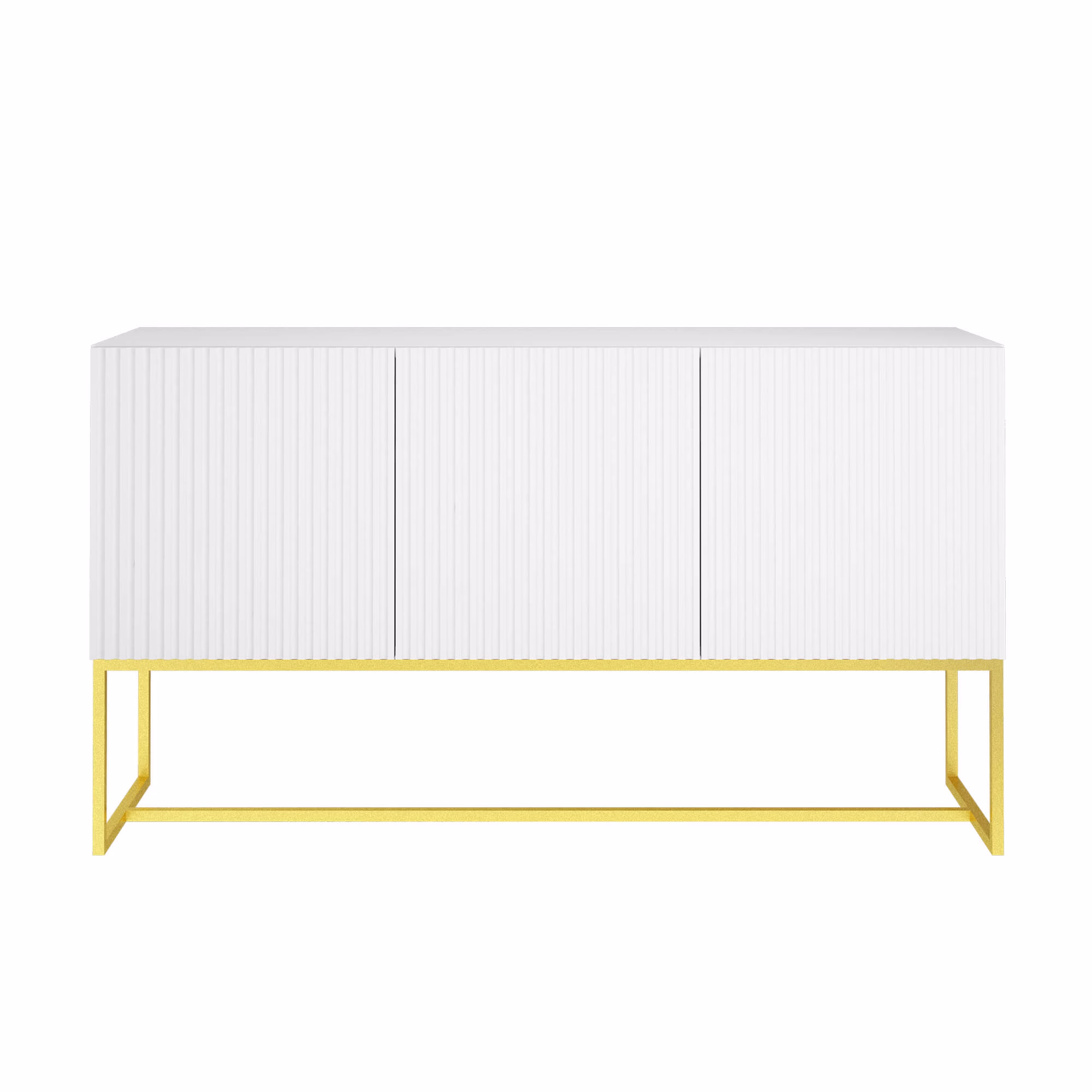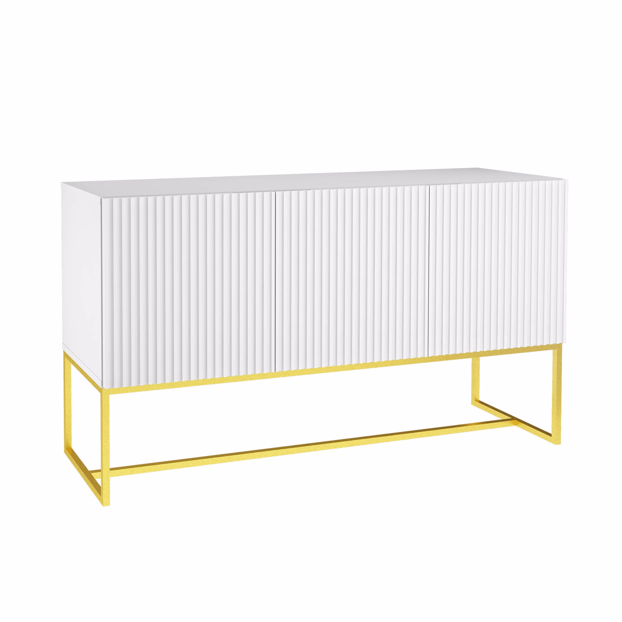As laterais e o tampo são curvados, o que dá ao móvel um visual leve mesmo sendo robusto. As portas têm dobradiças com amortecimento, então fecham devagar e sem barulho. Por dentro, prateleiras ajudam a organizar louças, copos ou o que você quiser esconder ali. Os pés são de metal com acabamento em laca, e você escolhe a cor da base na hora da compra.