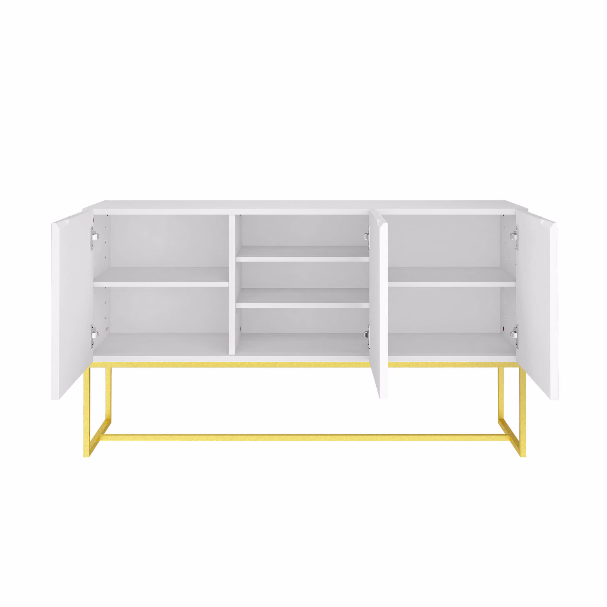Os pés de metal recebem acabamento em laca direto na fábrica. Você escolhe entre mais de 15 cores: dourado, preto, cobre, rosê gold, verde, azul e por aí vai. O corpo do buffet vem em 5 opções de lâmina: Castanho, Champanhe, Cinza Grafite, Ébano e Off-White.