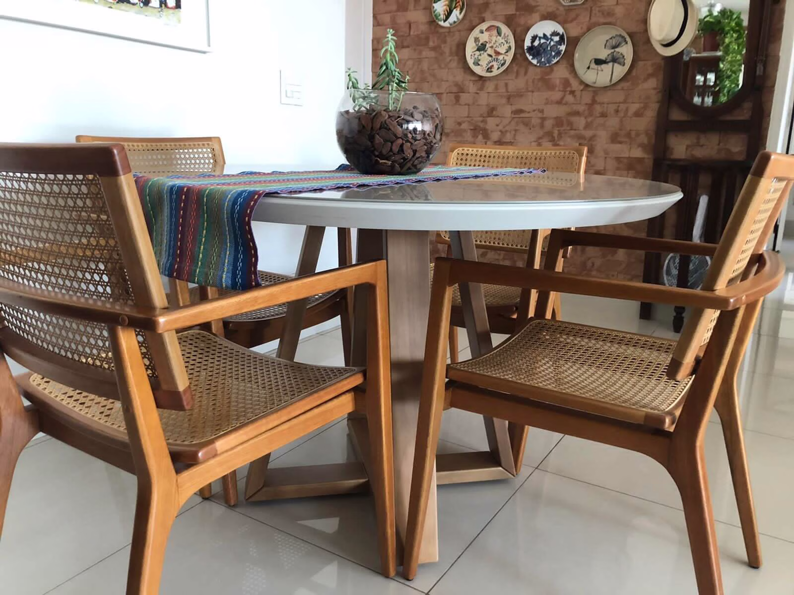 Trabalhamos com MDF de primeira linha, lâmina natural de madeira, pintura laqueada e palha indiana. Não usamos adesivo imitando textura de madeira. O acabamento é feito na nossa própria fábrica em Pedreira, SP, com controle de qualidade em cada etapa.
