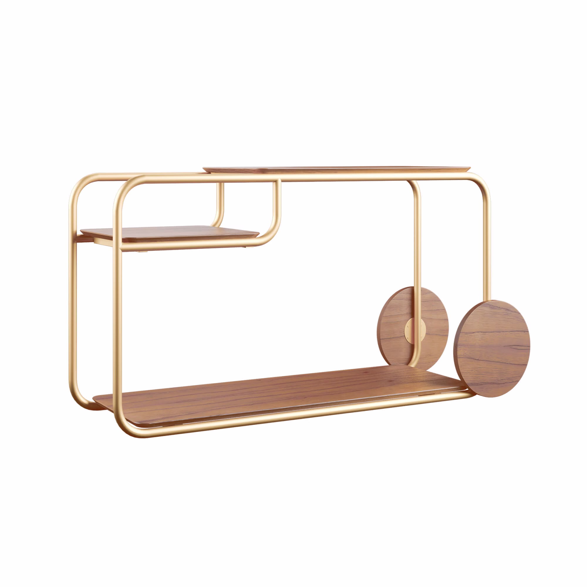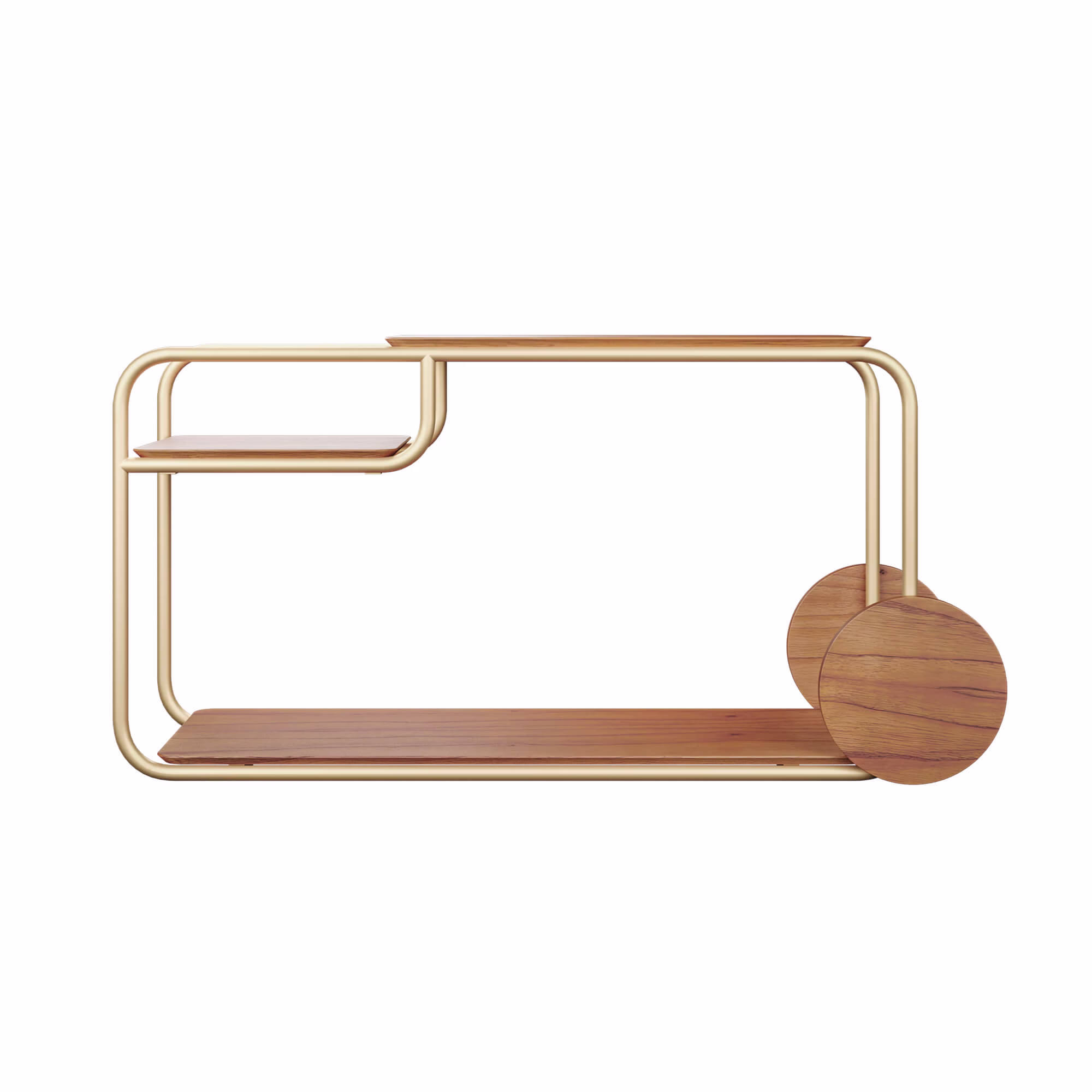 Os pés de metal recebem acabamento em laca direto na fábrica. Você escolhe entre mais de 15 cores: dourado, preto, cobre, rosê gold, verde, azul e por aí vai. O corpo do buffet vem em 5 opções de lâmina: Castanho, Champanhe, Cinza Grafite, Ébano e Off-White.