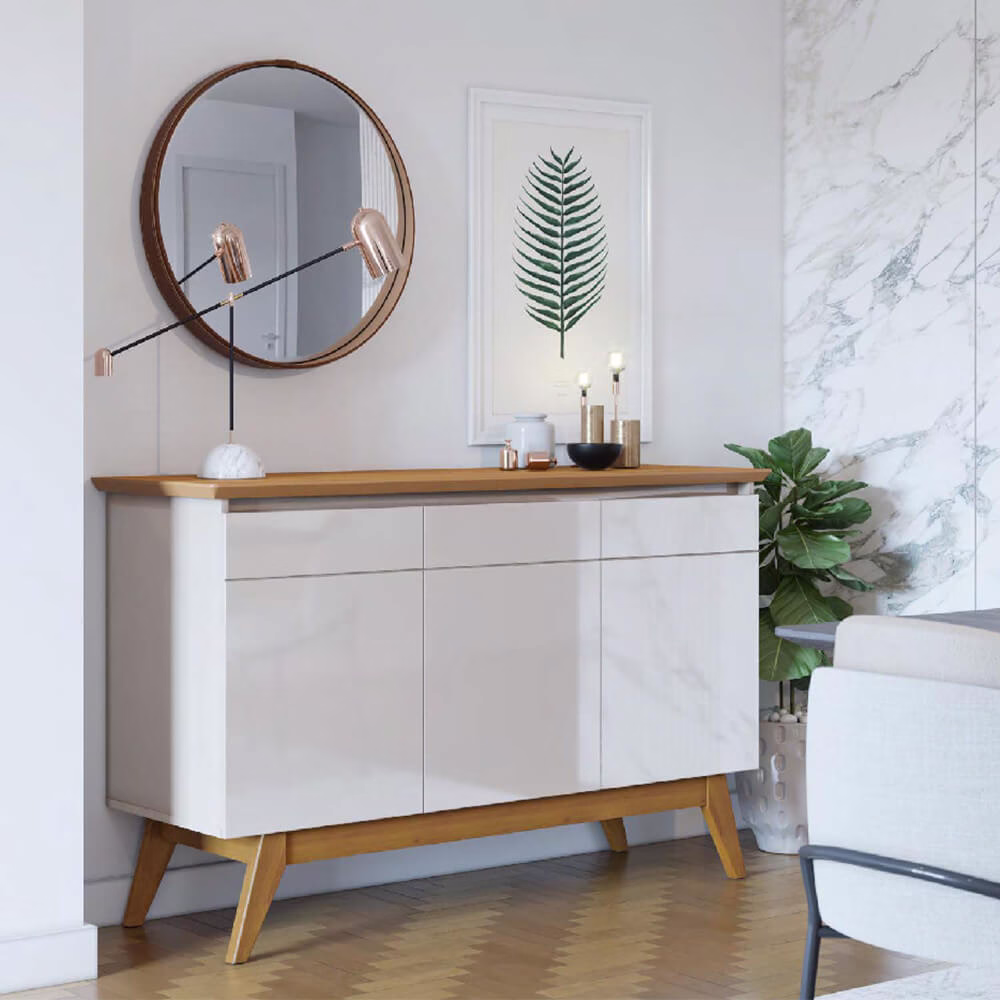 O buffet que fica bem na sala de jantar, no living e até naquele corredor que pedia alguma coisa. O Flow tem 113 cm de largura, o tamanho certo pra quem quer um móvel com presença sem dominar o ambiente. Portas, prateleiras internas e espaço pra guardar tudo o que precisa ficar organizado mas não precisa ficar à vista.