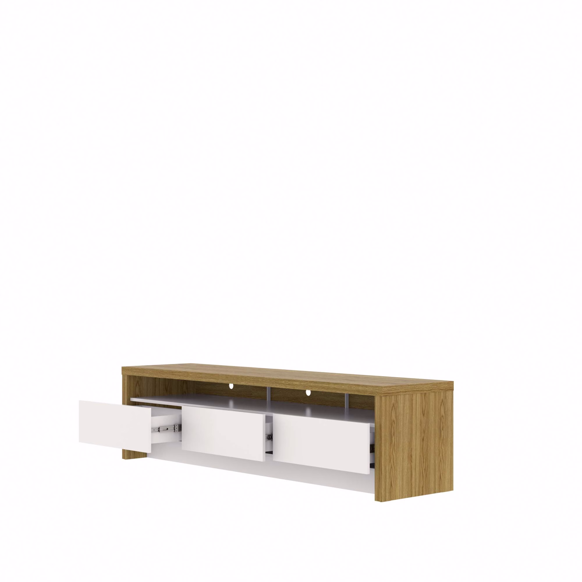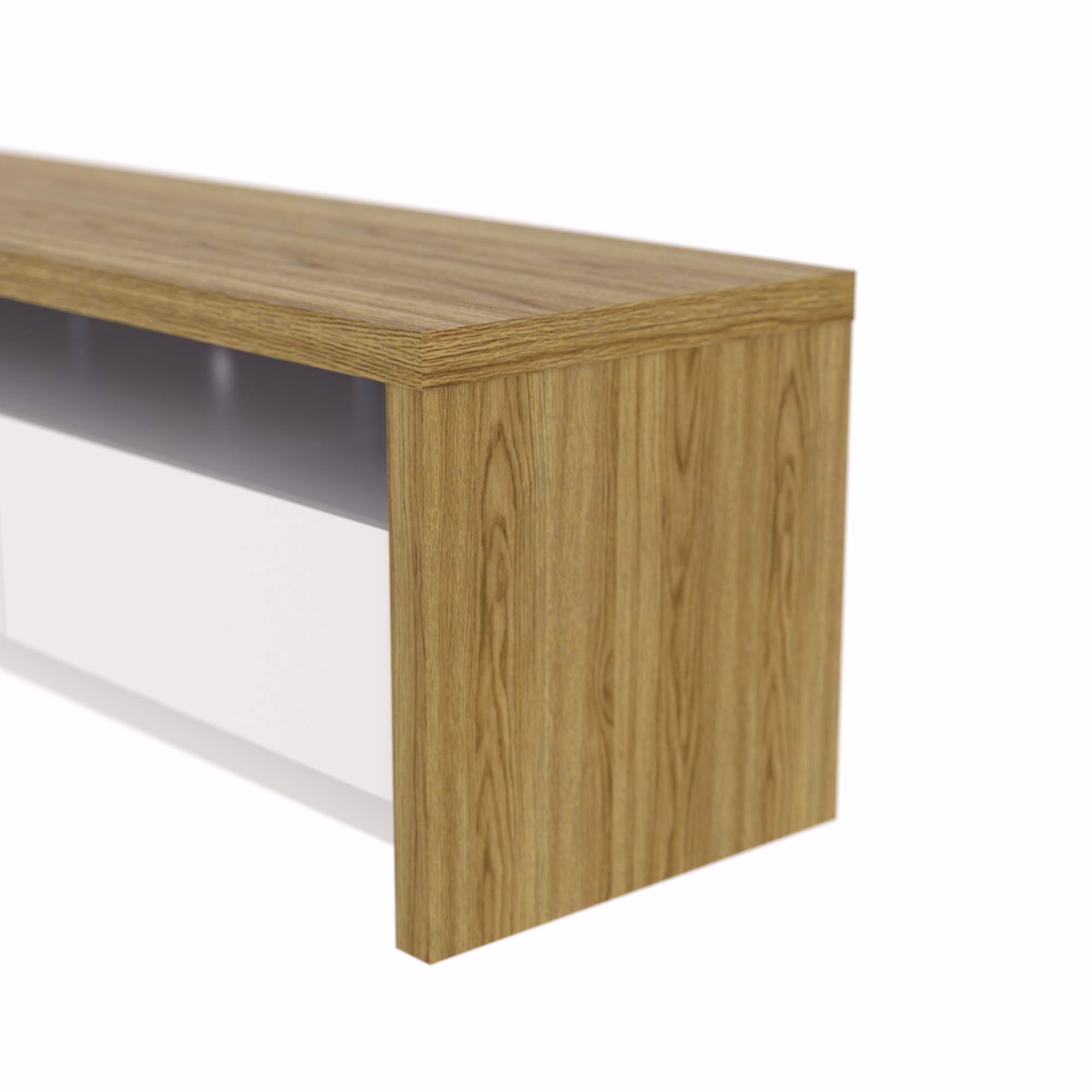 Nada de adesivo imitando textura. O corpo do Buffet Flow é revestido com lâmina natural de madeira sobre MDF de 19 mm, com acabamento em verniz fosco. Os veios são reais e você sente com o toque. Cada peça sai com desenho e tonalidade únicos.