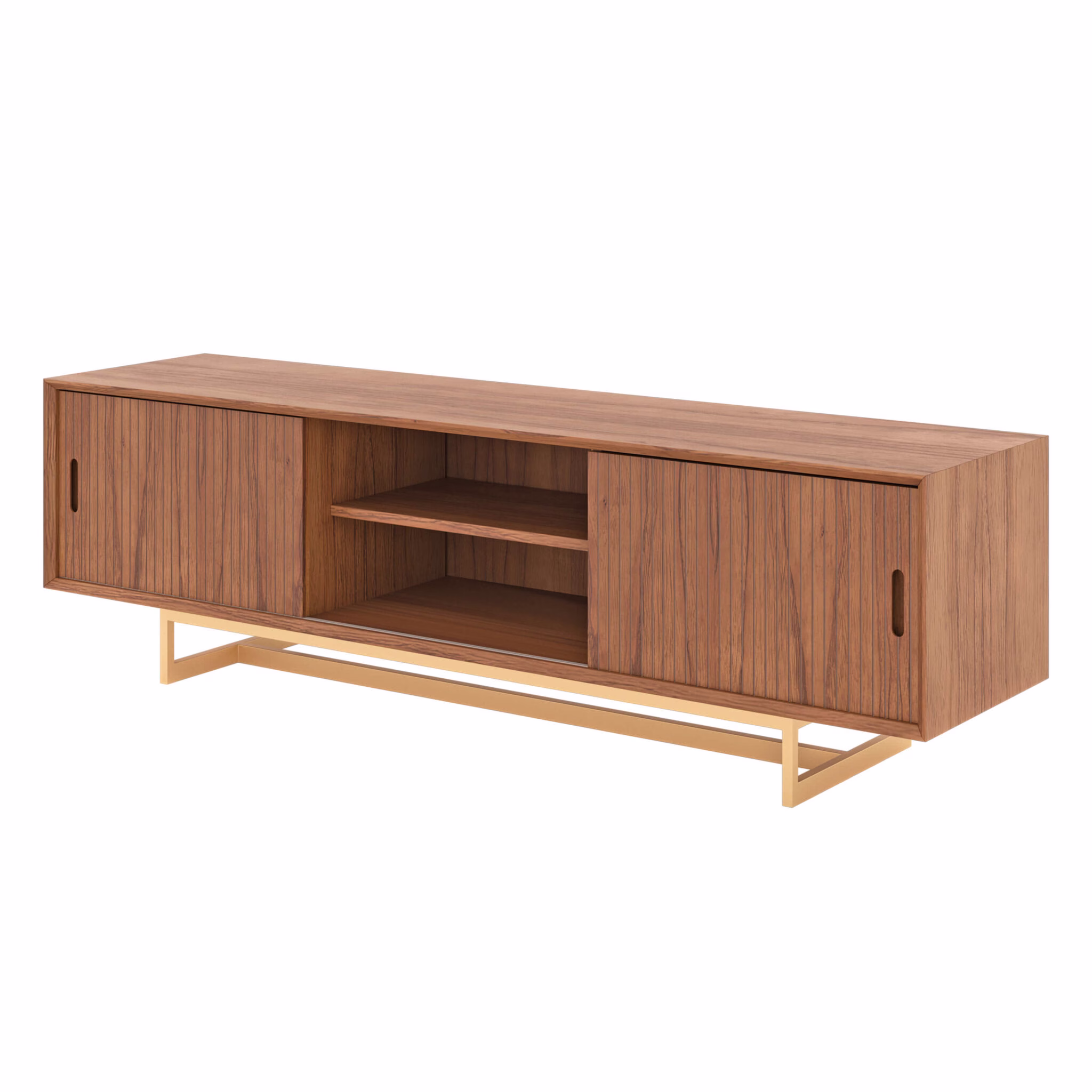 As laterais e o tampo são curvados, o que dá ao móvel um visual leve mesmo sendo robusto. As portas têm dobradiças com amortecimento, então fecham devagar e sem barulho. Por dentro, prateleiras ajudam a organizar louças, copos ou o que você quiser esconder ali. Os pés são de metal com acabamento em laca, e você escolhe a cor da base na hora da compra.